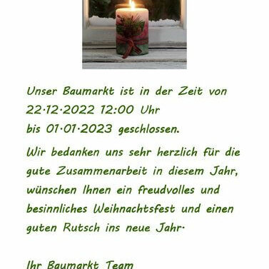 Baumarkt Weihnachtsurlaub Unser Baumarkt macht eine wohlverdiente weihnachtliche Pause. Unsere Damen sind ab Montag, 02. Jänner 2023 wieder gerne für Sie da.