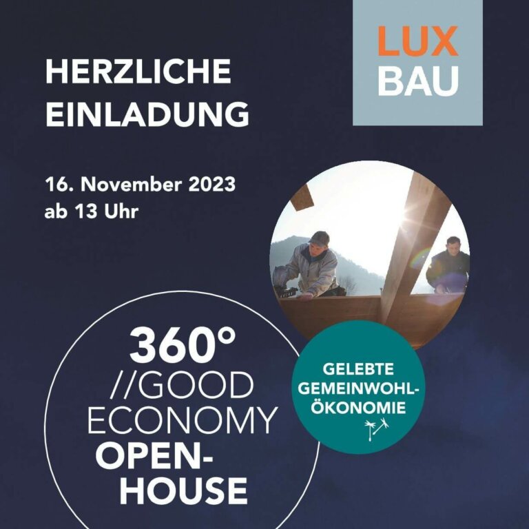 360°//Good economy Open House bei Lux Bau Wir freuen uns, Ihnen an diesem Tag gemeinsam mit dem Projektteam die Gemeinwohl-Ökonomie näher zu bringen, Erfahren Sie von Experten, was die Ziele…