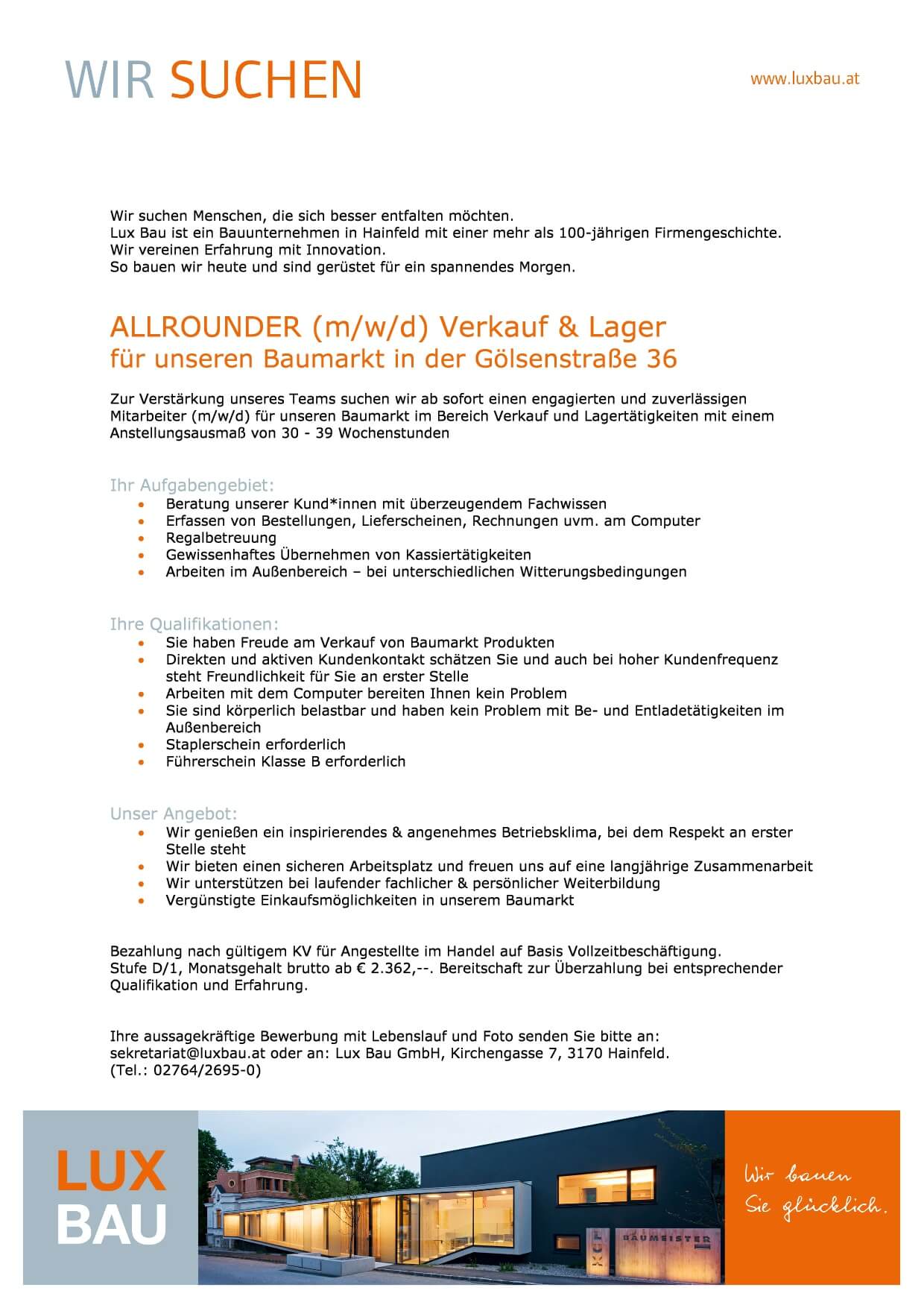 Ihre aussagekräftige Bewerbung mit Lebenslauf und Foto schicken Sie bitte an sekretariat@luxbau.at